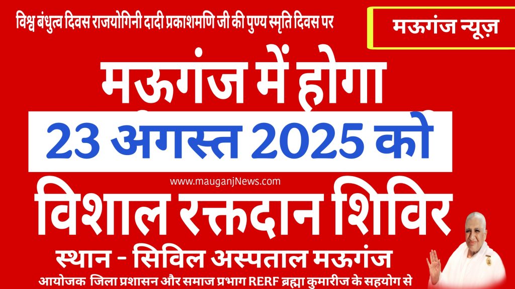मऊगंज : विश्व बंधुत्व दिवस राजयोगिनी दादी प्रकाशमणि जी की पुण्य स्मृति दिवस पर विशेष पूरे भारत और नेपाल में 22 अगस्त से 25 अगस्त तक रक्तदान अभियान चलाया जा रहा है जिसमें मऊगंज में भी ब्रह्मा कुमारीज संस्थान द्वारा 23 अगस्त को सुबह 10 से सिविल अस्पताल मऊगंज में विशाल रक्तदान अभियान का आयोजन किया गया है जिसमें आयोजक जिला प्रशासन एवं समाज प्रभाग RERF ब्रह्मा कुमारीज मऊगंज संस्थान है । इस राष्ट्रव्यापी रक्तदान अभियान में रेडक्रॉस सोसायटी रोटरी क्लब सहित अन्य संगठनों का सहयोग मिल रहा है ।